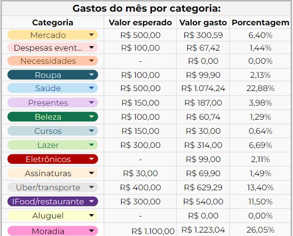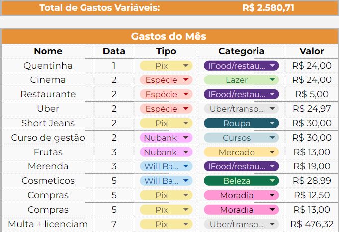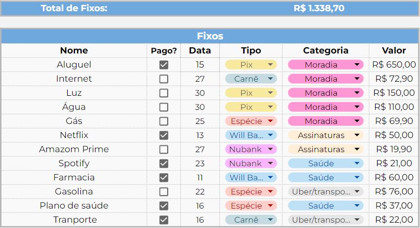mês, como aluguel, água, luz e etc.